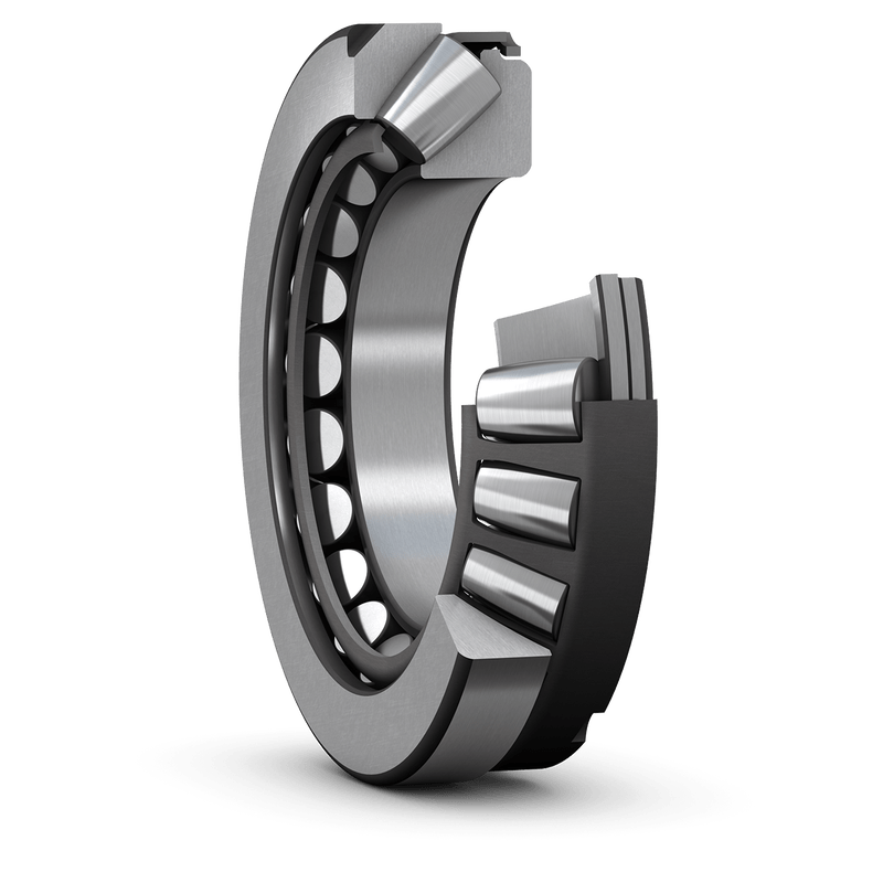 Los rodamientos axiales de rodillos a rótula admiten cargas axiales muy pesadas y cargas radiales considerables. Tienen la mayor capacidad de carga de todos los rodamientos axiales, lo que permite crear disposiciones de rodamientos compactas y de alta densidad de potencia. Una o dos ranuras de fijación en la arandela del soporte evitan que gire en el soporte.