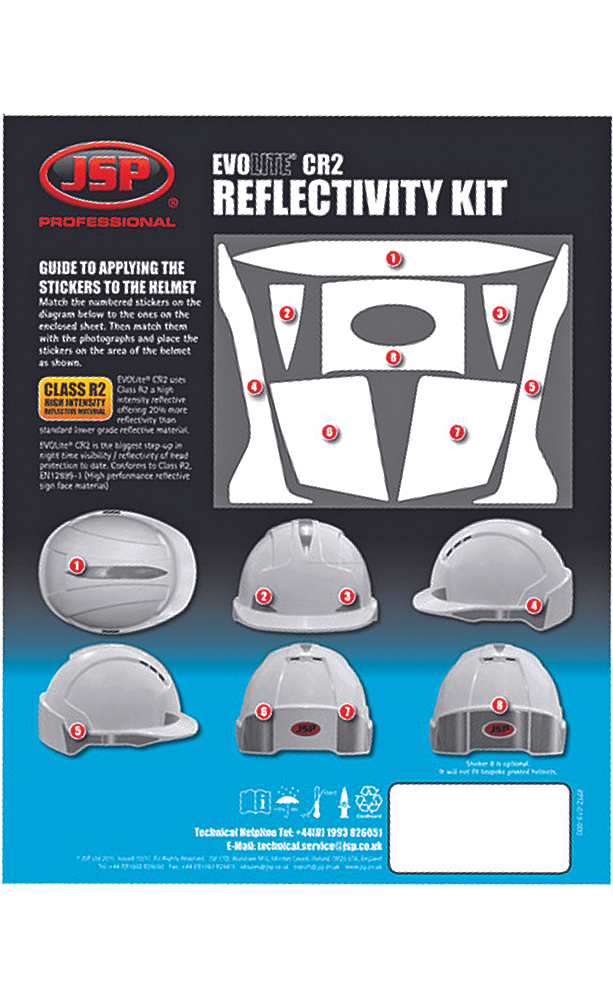Pegatinas reflectantes EVOLITE JSP en el casco para hacerlo más visible.