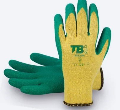 • Guante soporte algodón y poliéster amarillo reciclado sin costuras. • Recubrimiento látex rugoso verde en palma. • Puño elástico. • Galga 10.